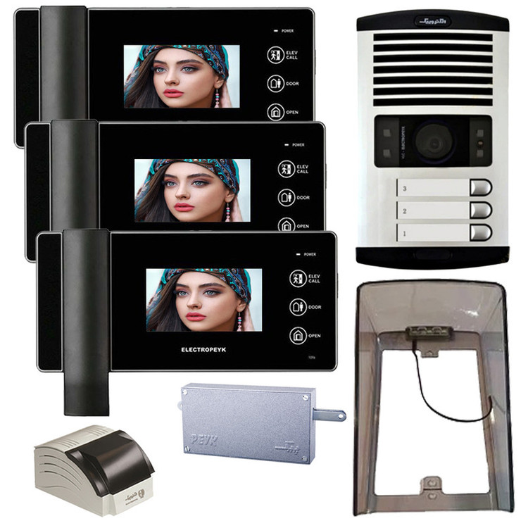 مجموعه دربازکن الکتروپیک مدل FD/1086/3/1096x3-Black .شامل : پنل دم دری 1086 با قابلیت دید در شب و مجهز به چراغ LED میباشد . جنس بدنه این پنل آلومینیوم میباشد و دارای سوییچ ضد سرقت است.گوشی تصویری مدل 1096 الکتروپیک دارای نمایشگر 4/3 اینچ. با قابلیت های اتصال به دو صفحه دم دری . اتصال به دوربین امنیتی .فراخوان آسانسور .دارای کلیدهای لمسی. ذخیره عکس و فیلم .ضبط فیلم با صدا . اتصال کارت حافظه .دارای 10 ملودی زنگ .شرکت الکتروپیک یکی از شناخته شده ترین برند های تولیدکننده آیفون تصویری است که با طراحی و تولید انواع درب بازکن تصویری ساده، لوکس و کاربر پسند توانسته بین رقبای خارجی و ایرانی خود جایگاه خوب و مطمئنی را برای خود داشته، و از آن استفاده تمام کمالی را برده، و باعث این امر شده که این کمپانی ها سال ها به تولید آیفون تصویری رنگی با مدل ها و رنگ های مختلف بپردازد.بارانگیر شفاف LED دار پارس صنعت ماهان از کیفیت مطلوبی برخوردار است و از پنل دم دری در برابر نور خورشید، گردوخاک، باران، برف و تگرگ محافظت می کند.چراغ های LED تعبیه شده بر روی این بارانگیر باعث افزایش دید در شب دوربین پنل آیفون می گردد.جنس بدنه این محافظ پلی کربنات UV دار می باشد که در برابر رنگ پریدگی بسیار مقاوم است. این پکیج شامل پنل دم دری+گوشی تصویری+منبع تغذیه+قفل زنجیری+محافظ بارانگیر می باشد. این پکیج کامل می باشد و با خرید آن نیازی به خرید سایر اقلام نخواهید داشت.