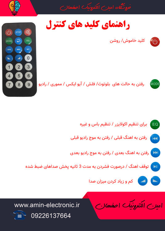 کنترل یدکی اسپیکر و ماژول های فلشخور و بلوتوثی (mp3 plaer) همراه با باتری مرغوب.
