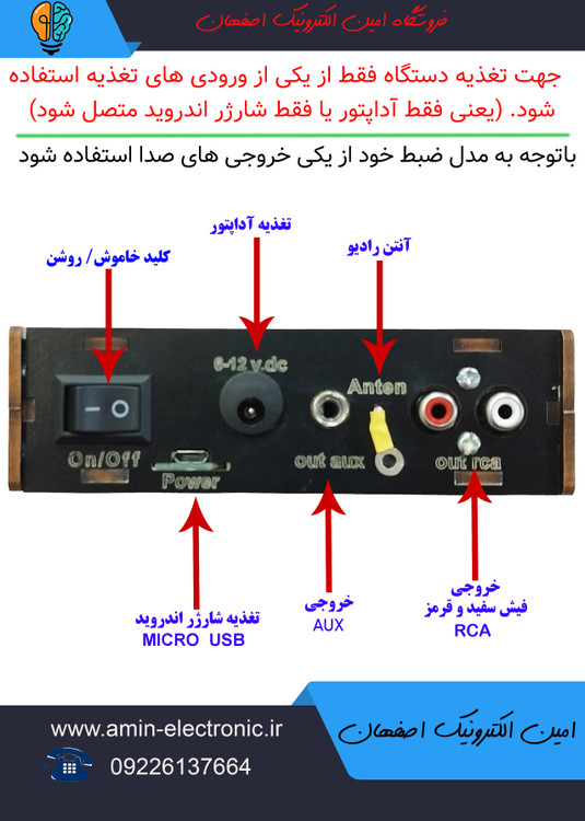 برای تامین برق دستگاه شما میتوانبید از آداپتور 6 الی 12 ولت یک آمپر استفاده کنید یا اینکه از شارژر اندروید { micro USB} استفاده نمایید.